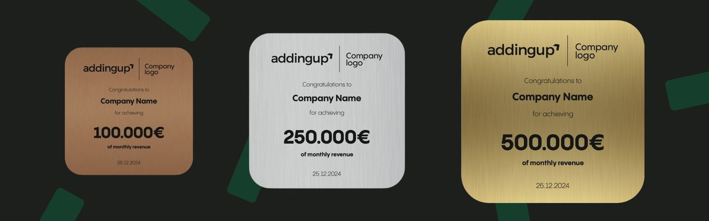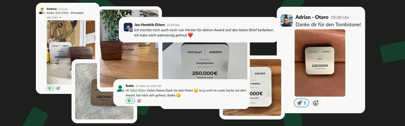 Regelmäßig knacken wir mit unseren Partner-Brands Umsatzrekorde. Manchmal ist es von 0 auf 10.000€ Monatsumsatz, dann auf die ersten 100.000€ Umsatz. Aber manchmal auch von 300.000€ auf 1.000.000€ im Monat. Für solche Meilensteine haben wir unsere addingup Awards mit denen wir diese Erfolge feiern.