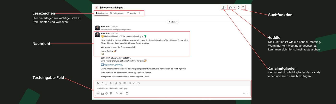 Für die tägliche Kommunikation nutzen wir das Tool Slack. Hier kannst du ähnlich wie bei einem Messaging Tool Nachrichten schreiben um mit uns im operativen Tagesgeschäft zu schreiben.