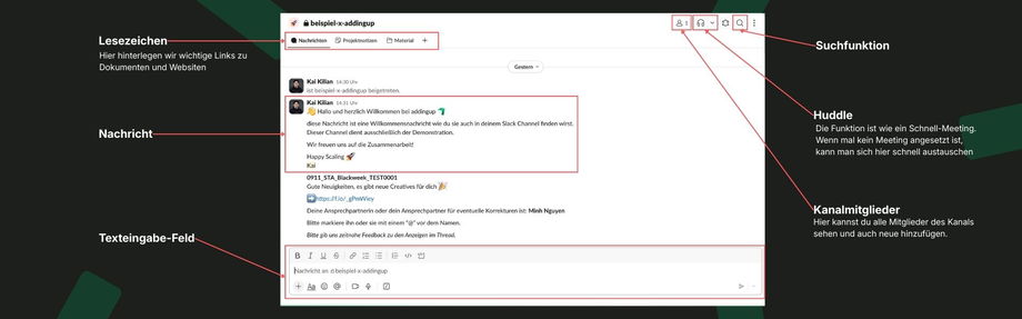 Wir verbinden uns über Slack Connect. Für die Verbindung zu eurem Unternehmen benötigen wir lediglich die Information wer dem Channel hinzugefügt werden soll.